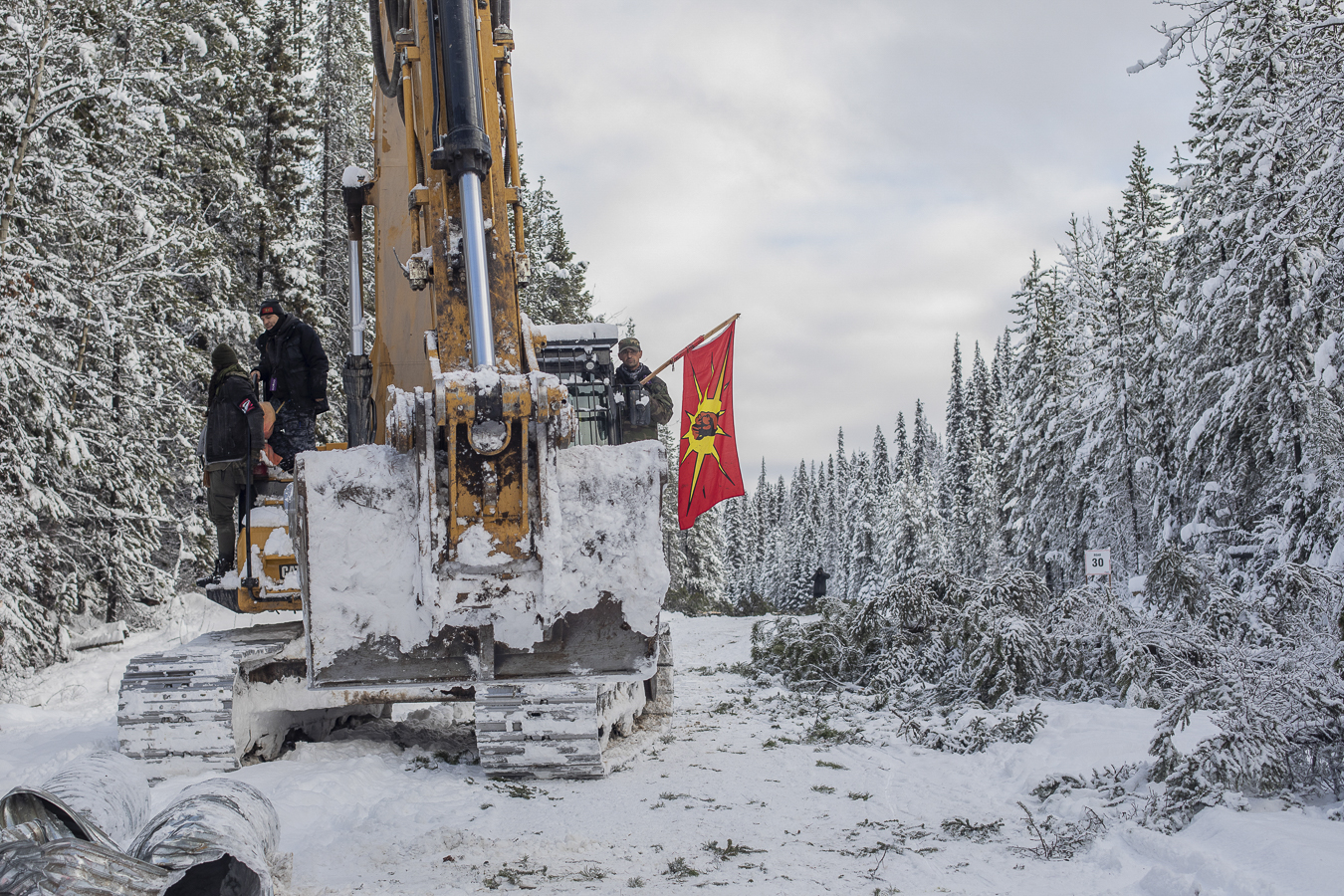 Haudenosaunee supporters Logan Staats, left to right, Teka’tsihasere, or Corey Jocko and Skyler Williams ride a CGL excavator as they help to close the road in Gidimt’en territory near Houston, BC on Sunday, November 14, 2021. Hereditary chiefs served a mandatory evacuation order for all CGL workers and sub-contractors. Chief Woos gave an 8 hour window for everyone to depart and granted a two hour extension but of the over 500 workers at two camps, only a small handful of pickup trucks left.