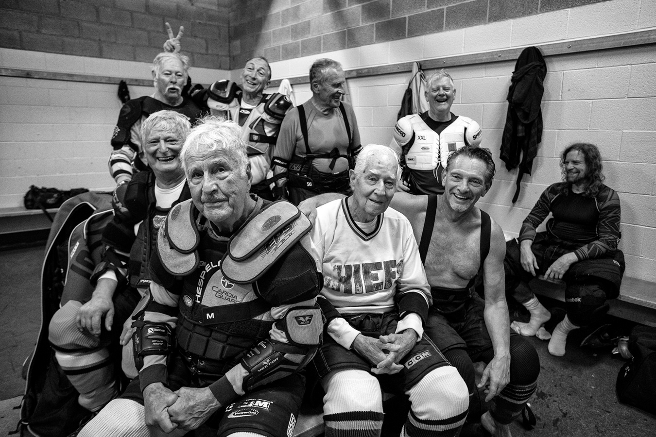In the locker room after playing, this group of seniors break down their uniforms to the pads. This group of Senior Ice Hockey players plays twice a week, for two hours. The two players in front are 89, and 90 years old. Skaneatles, New York. 2018