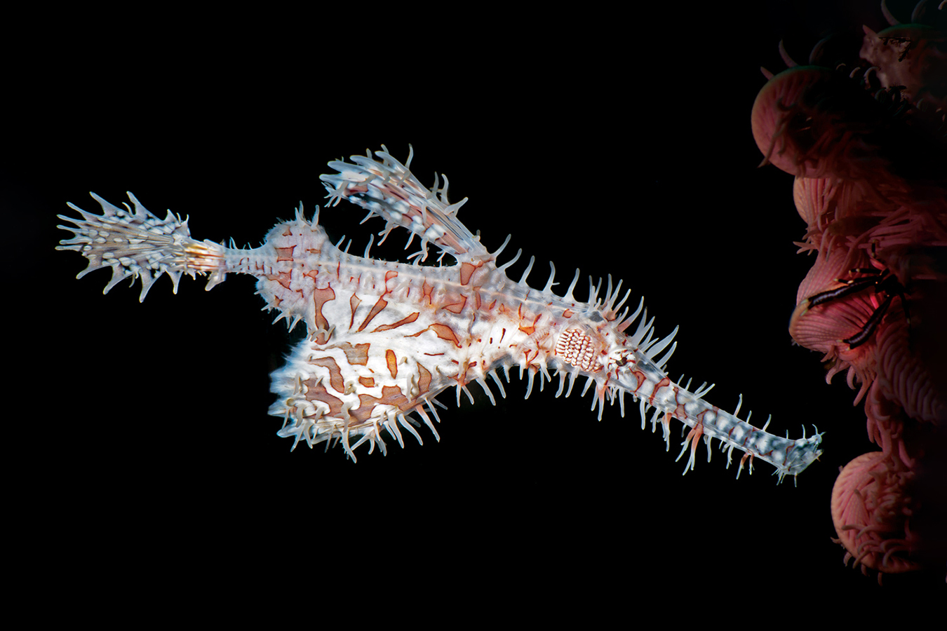 “Ghost pipefishes” are delicate, camouflaged marine fishes closely related to seahorses and pipefishes. They drift among corals, seagrasses, or crinoids, mimicking their surroundings with their elongated bodies and intricate patterns. Location: Tulamben, Bali Island, Indonesia, 2023.