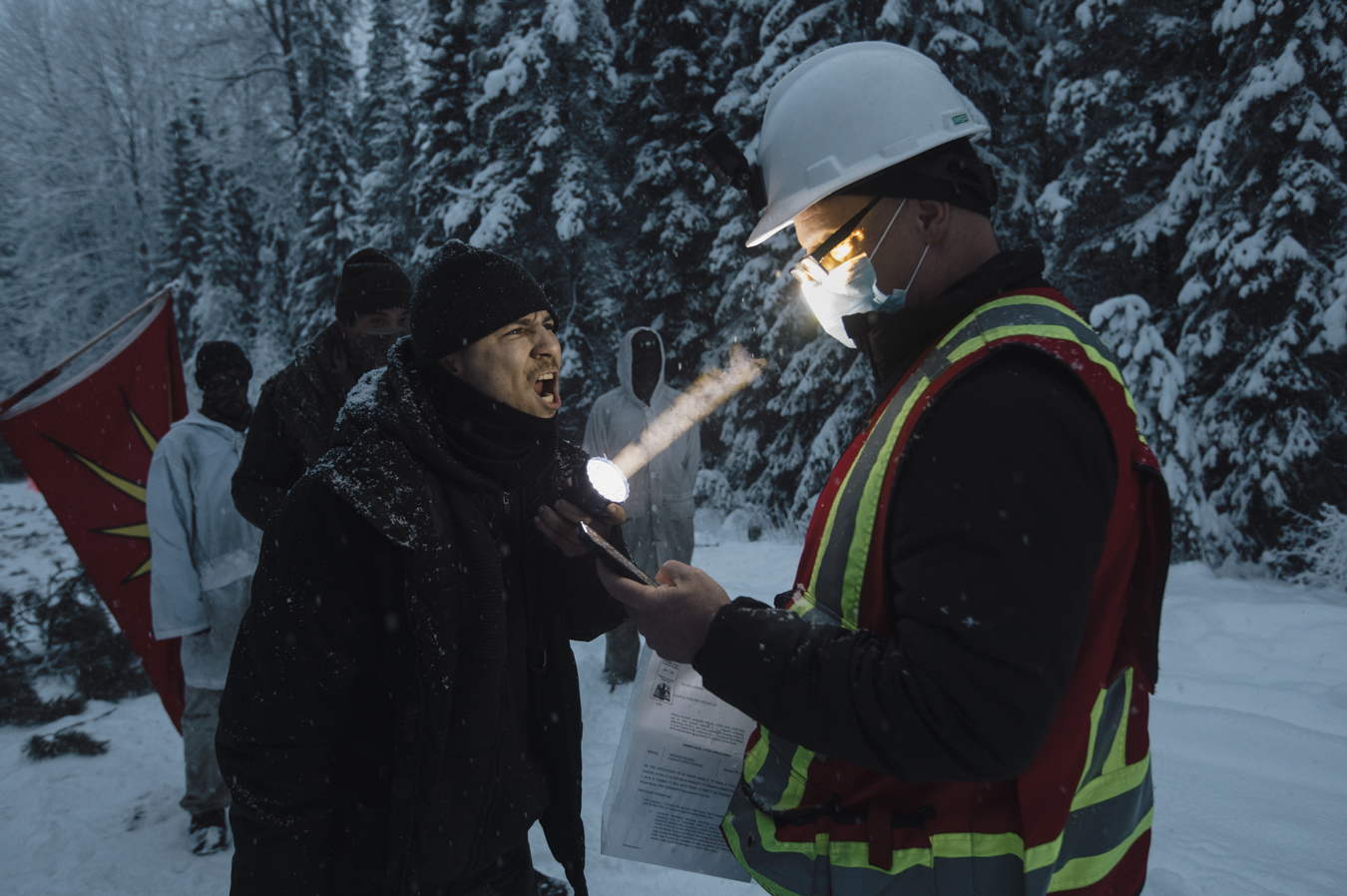 Haudenosaunee supporter Teka’tsihasere Corey Jocko, aka Jayohcee, whoops in response to a Coastal GasLink worker reading the injunction in Gidimt’en territory near Houston, BC on Sunday, November 14, 2021.