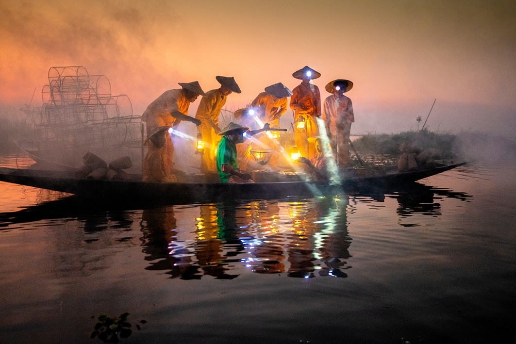 In the late evening at Inle Lake, local fishermen share their freshly caught fish under the glow of headlamps before returning home.