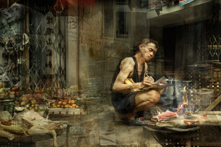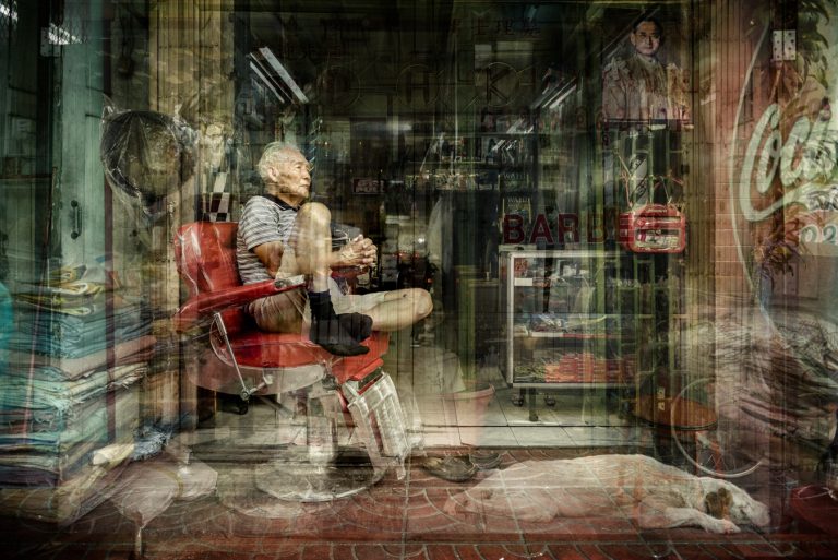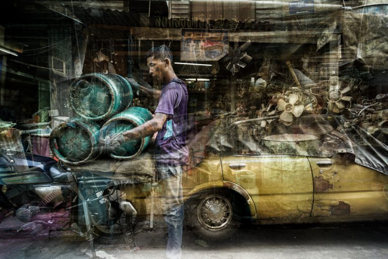 In Bangkok, Riccardo Magherini’s fine art practice turns decisively toward portraiture. His focus moves to people as presences shaped by the spaces they inhabit. Each portrait is deeply connected to its surroundings, allowing textures, light, and objects to suggest untold stories. The streets and interiors are not backgrounds but active elements, framing lives in motion.