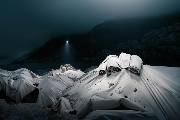 In 2009, thermally reflective blankets were used to cover a large portion of the once-mighty Rhone Glacier, home to Europe's largest man-made ice cave. Intended to slow the glacier's retreat, 15 years later and the battle is lost. The coverings have deteriorated, hanging in tattered shreds over the last blocks of ice, like the torn skin of a colossal, dying beast.