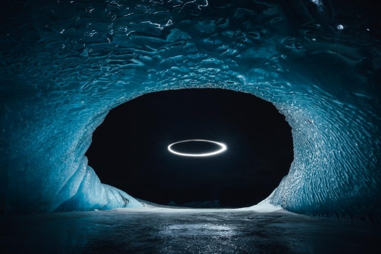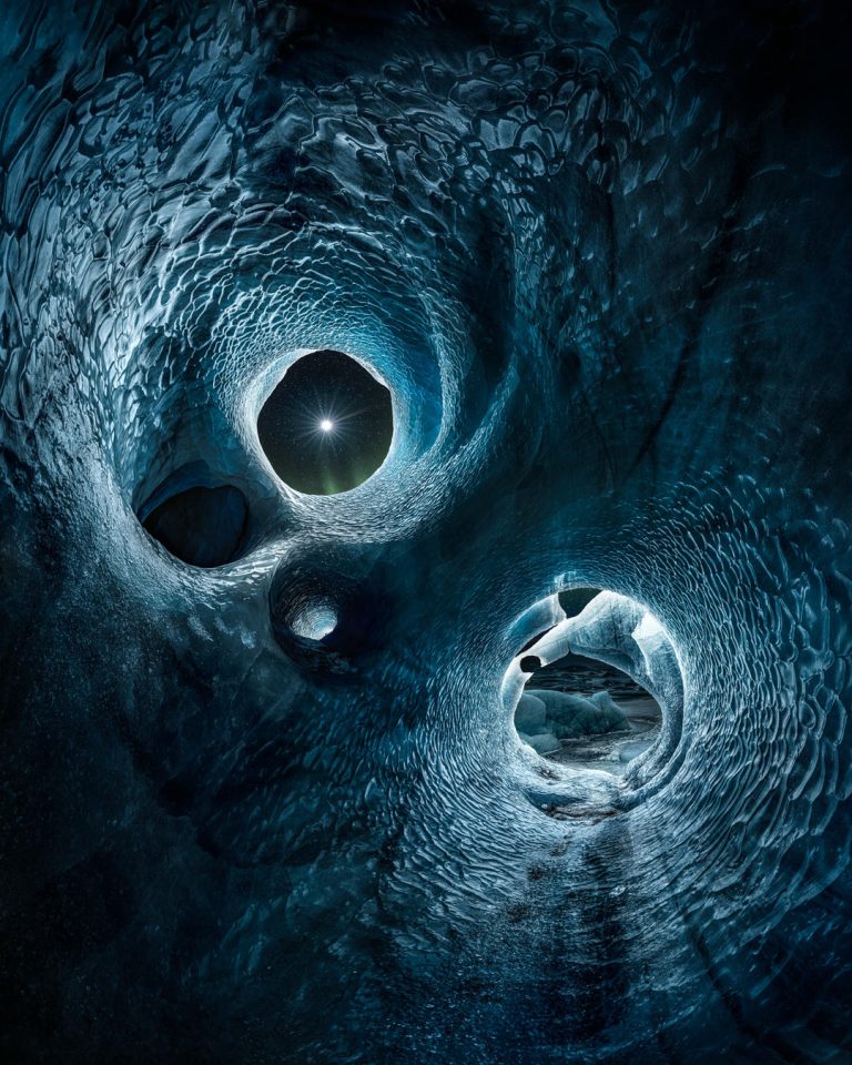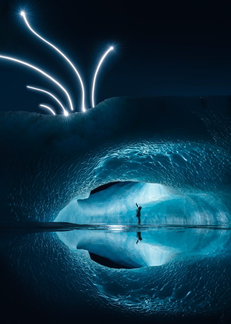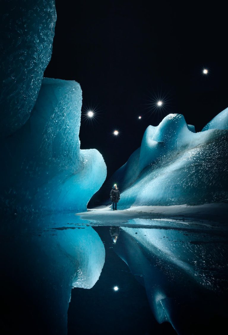 As glaciers reach their terminus in Iceland’s frozen landscape, they calve icebergs into glacial lagoons. These lagoons form where meltwater collects in valley floors, freezing solid under extreme winter temperatures and locking the icebergs in place. After a sudden downpour, the frozen surface was briefly flooded with rainwater, transforming the ice into a vast mirror that reflected the surrounding landscape. The scene was surreal, as if the lagoon itself had become a window into another world.